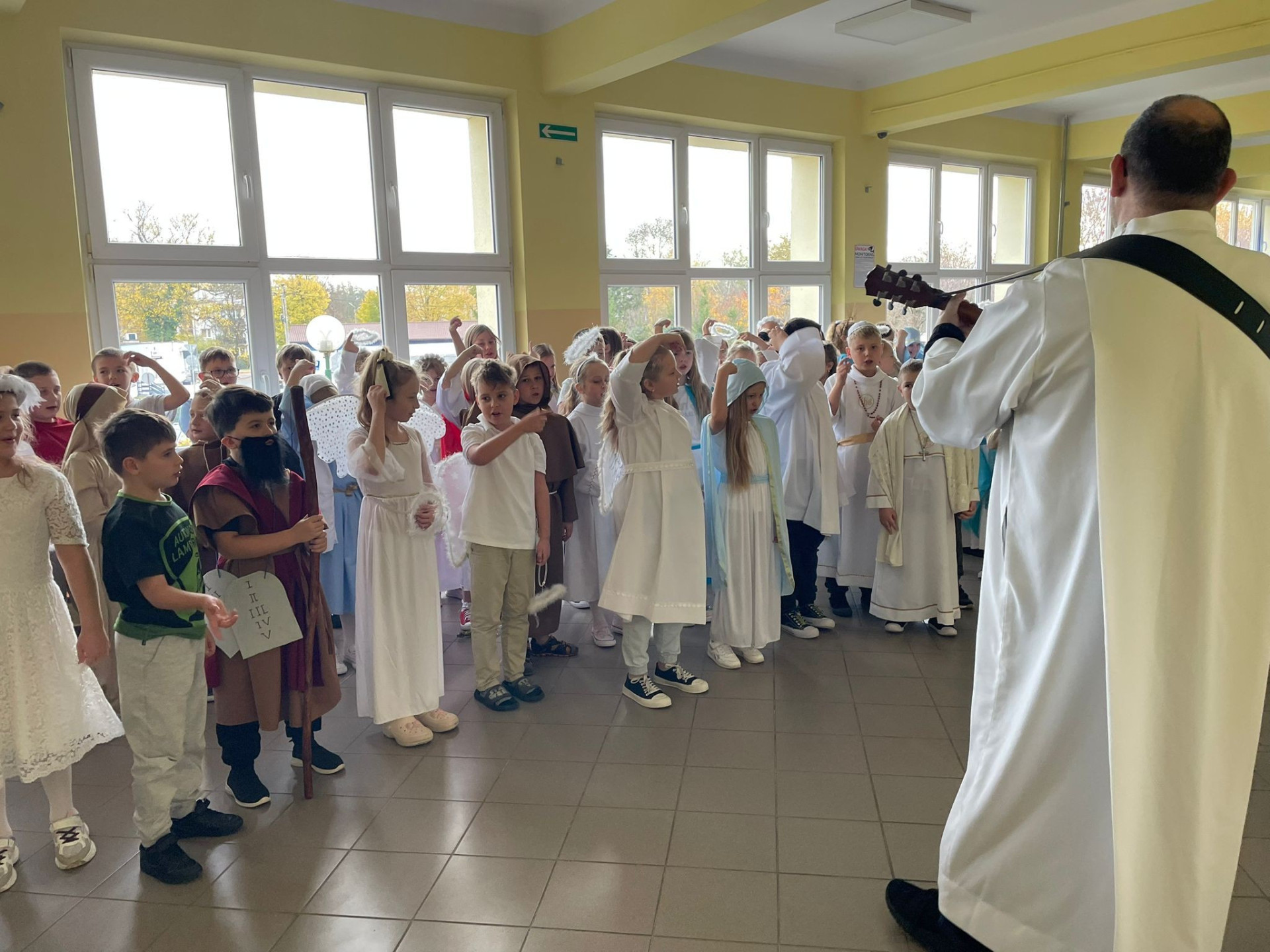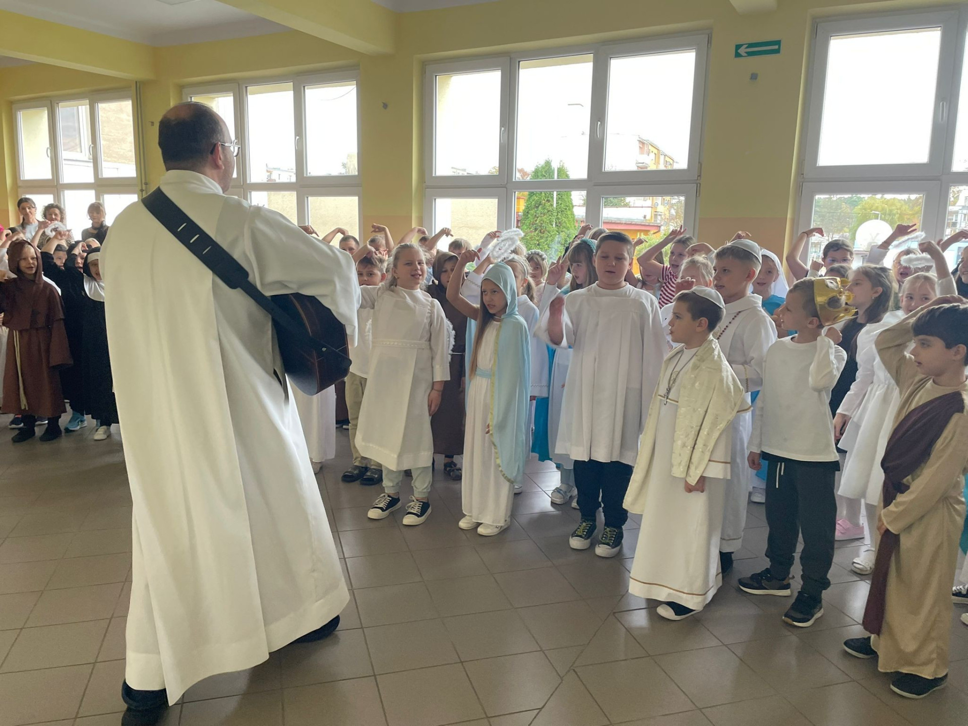 Dziś w szkole odbył się radosny Bal Wszystkich Świętych pod opieką ks. Pawła Koralewskiego. Uczniowie przebrali się za swoich ulubionych świętych, a szkolne korytarze wypełniły się śpiewem, tańcem i uśmiechem! To piękne wydarzenie przypomniało nam, że świętość jest radością, światłem i miłością, a każdy z nas jest powołany, by nią promieniować na co dzień.